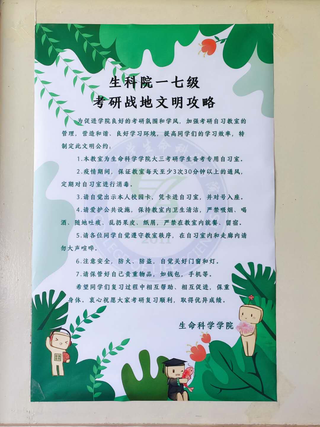 配备的医疗箱、测温仪及藿香正气水、板蓝根、感冒冲剂等常用非处方药,解决封闭期间学生前往校医院的不便;文化先锋岗负责开通文体放松小站,每周播放电影及音乐会视频、组织体育活动等,缓解备考压力;文明督察岗按照《生科院17级考研战地文明攻略》,督促文明言行,确保考研教室安静秩序的学习环境。