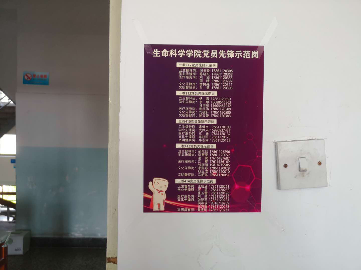 “党员先锋岗”分别在第一教学楼、第三教学楼挂牌,返校的17级党员全体上岗,覆盖到全部考研教室,同时将各个岗位的党员进行公示。卫生督导岗保障环境整洁,按照疫情防控要求,确保教室每日三次通风、一人一桌、定期消毒等日常管理。学业先锋岗负责最新备考资讯的搜集整合及发布,对备考过程中出现的问题,进行初步的集中整理,联系或询问专业教师给予解答;医疗服务岗负责管理麻豆