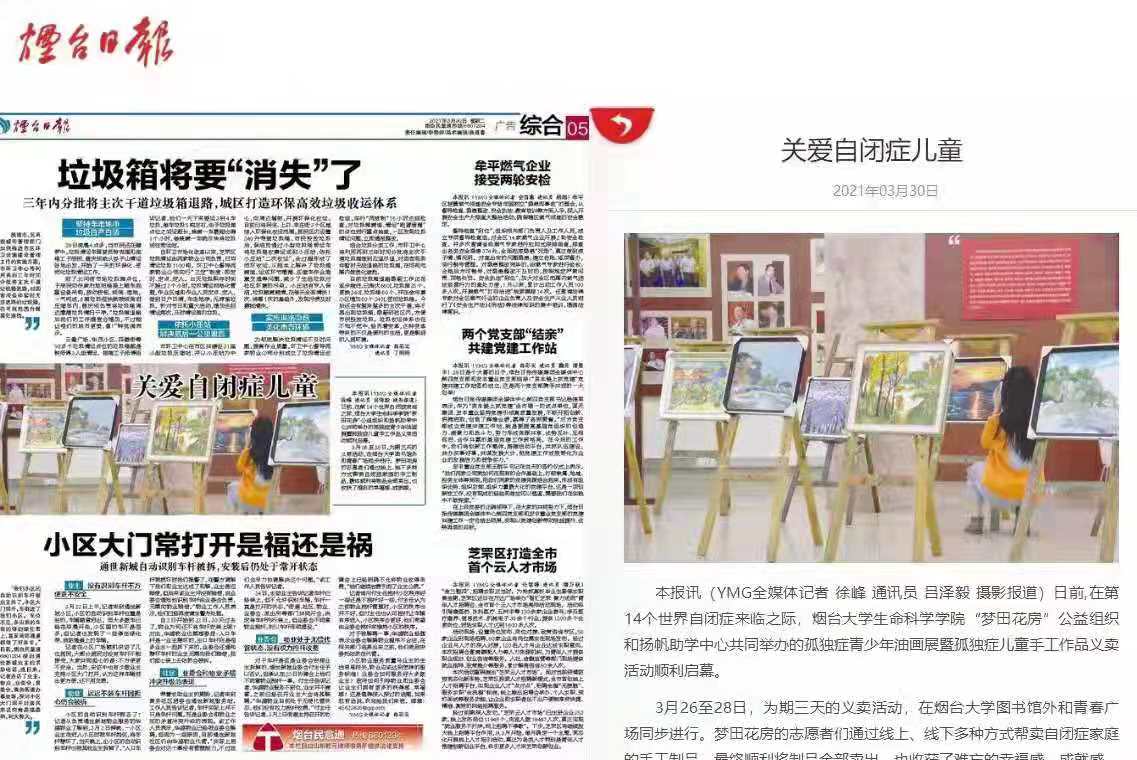 育人的重要载体,形成以“关爱儿童心灵成长”为主线,以“生命之光、个性之光、美育之光”为支线的完整成长辅助体系,在为少年儿童提供服务和引导的同时,团队成员也在课程建设、儿童认知启发、综合素质教育的过程中,充分施展智慧才能,获得“教学相长”的成就感。2021年与烟台市扬帆公益发展中心联合主办自闭症青少年油画展暨关爱自闭症家庭义卖活动,事迹刊文于《烟台日报》。成员张梦迪的战疫服务事迹登上人民日报客户端,彰显新时代大学生志愿者的青春担当。