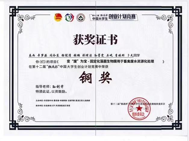 《变“废”为宝-固定化藻菌生物膜用于畜禽废水资源化处理》项目获得第十二届挑战杯竞赛铜奖