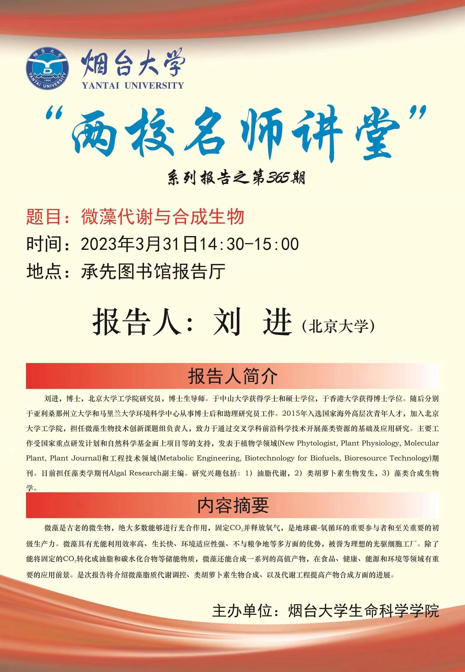 学术报告预告-“两校名师讲堂”系列报告之微藻代谢与合成生物