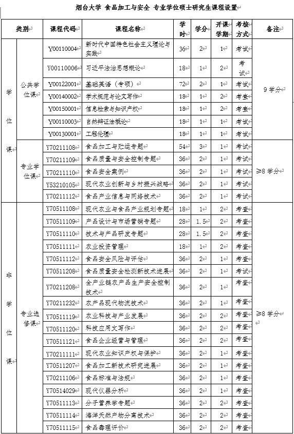 根据“食品加工与安全”领域农业硕士的培养目标和要求,课程设置以实际应用为导向,以职业需求为目标,以综合素养和应用知识与能力的提高为核心。本领域课程设置和教学内容体现宽广性、综合性、实用性和前沿性,培养学生自我学习和获取新知识的能力、掌握该领域的技术和管理知识在生产实践中的运用能力;加强全日制研究生实践教学,鼓励学生对产业发展的技术和管理难题开展研究并能有所创造性地提出解决方案。